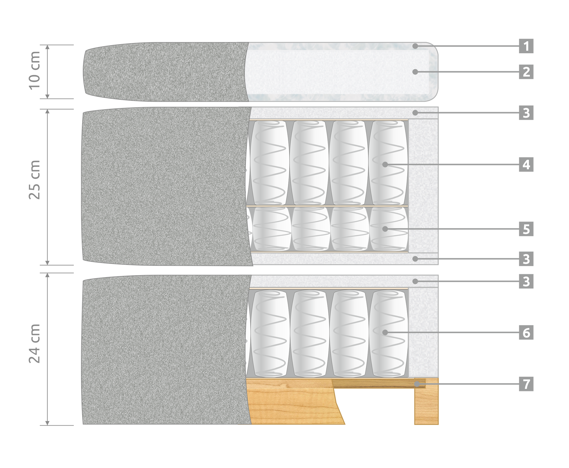 Kantförstärkt Underbädd: Med en kantförstärkt underbädd av 40mm polyeter får du extra stöd längs sängens kanter, vilket förhindrar att sängen slits ojämnt över tid och förlänger dess livslängd.
